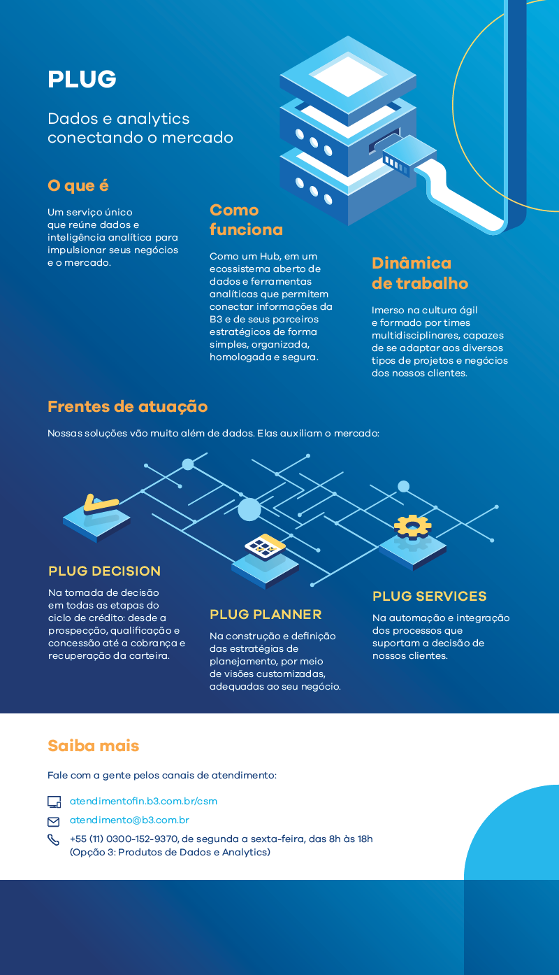 O Plug funciona como um Data Hub, transformando dados em soluções customizadas que ajudam a impulsionar a inovação e o desenvolvimento do mercado, beneficiando instituições financeiras, fintechs e empresas que lidam com crédito em seu dia a dia.